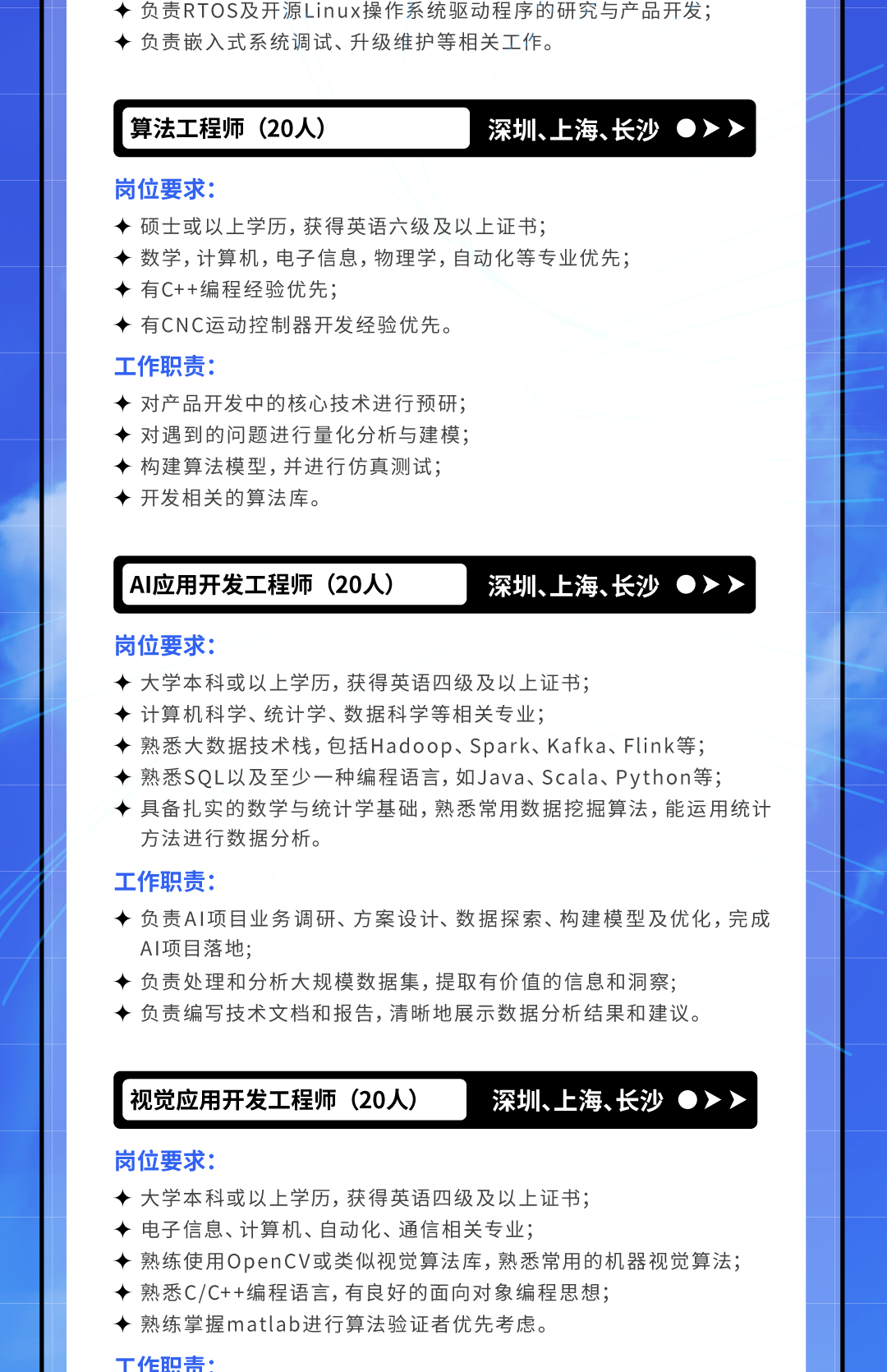 關(guān)鍵字:“創(chuàng)新力量 族夢(mèng)未來” 2025年大族智控創(chuàng)新人才招募計(jì)劃、人才招聘、崗位:控制軟件開發(fā)工程師、CAM軟件開發(fā)工程師、嵌入式開發(fā)工程師、算法工程師、AI應(yīng)用開發(fā)工程師、視覺應(yīng)用開發(fā)工程師、可靠性工程師、結(jié)構(gòu)工程師、應(yīng)用工程師、軟件測(cè)試工程師、技術(shù)支持工程師、銷售工程師。