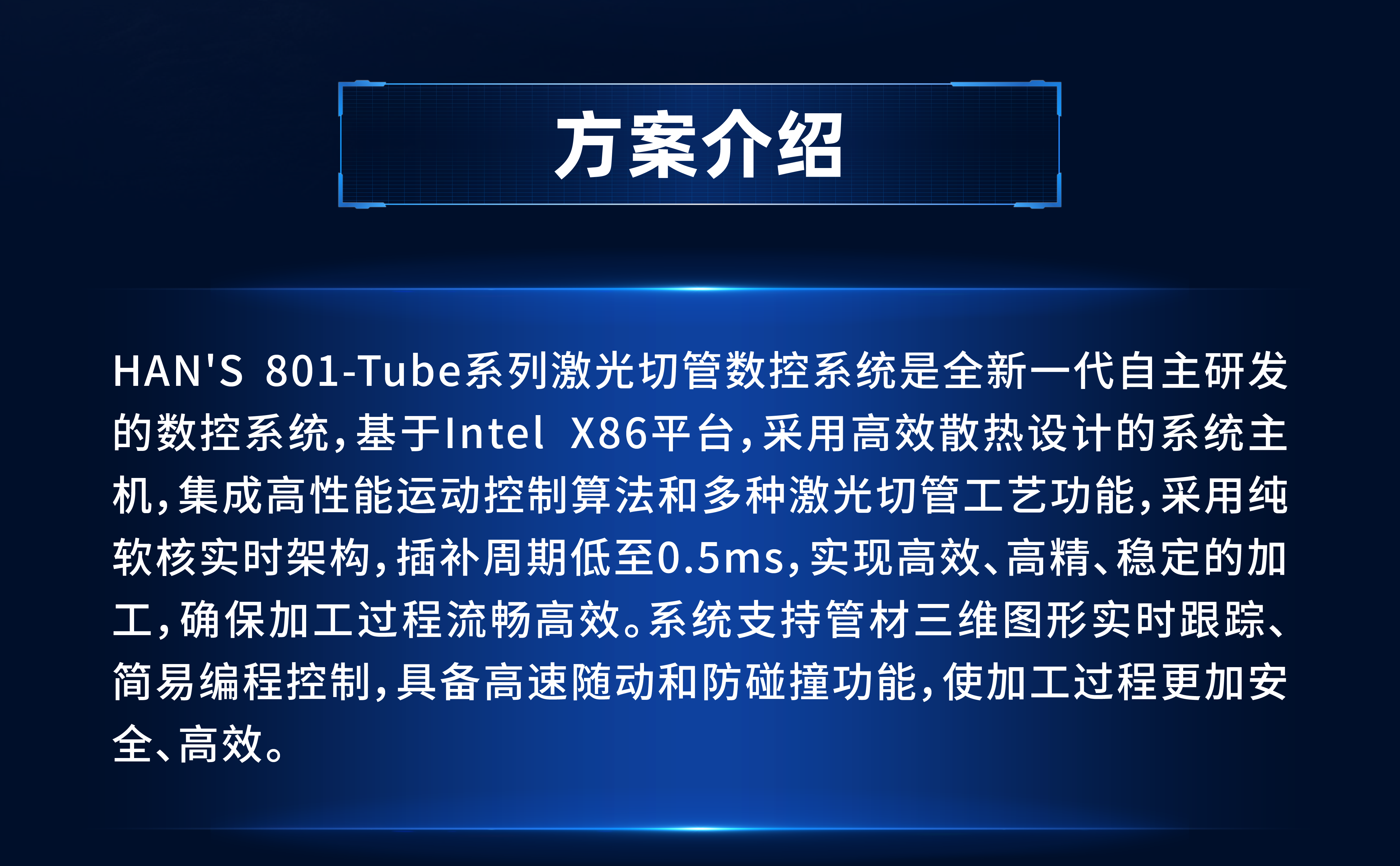 關(guān)鍵字:大族智控激光切管智能控制解決方案全新升級、效率提升、功能升級、HAN'S 801-Tube、激光切管數(shù)控系統(tǒng)、蛙跳、不抬頭切割、飛行切割、在線CAM、三維跟蹤顯示、免畫圖、生產(chǎn)計劃、靈活的加工方式、豐富的接刀功能、尋中、狀態(tài)監(jiān)控、工藝文件存儲、功率曲線