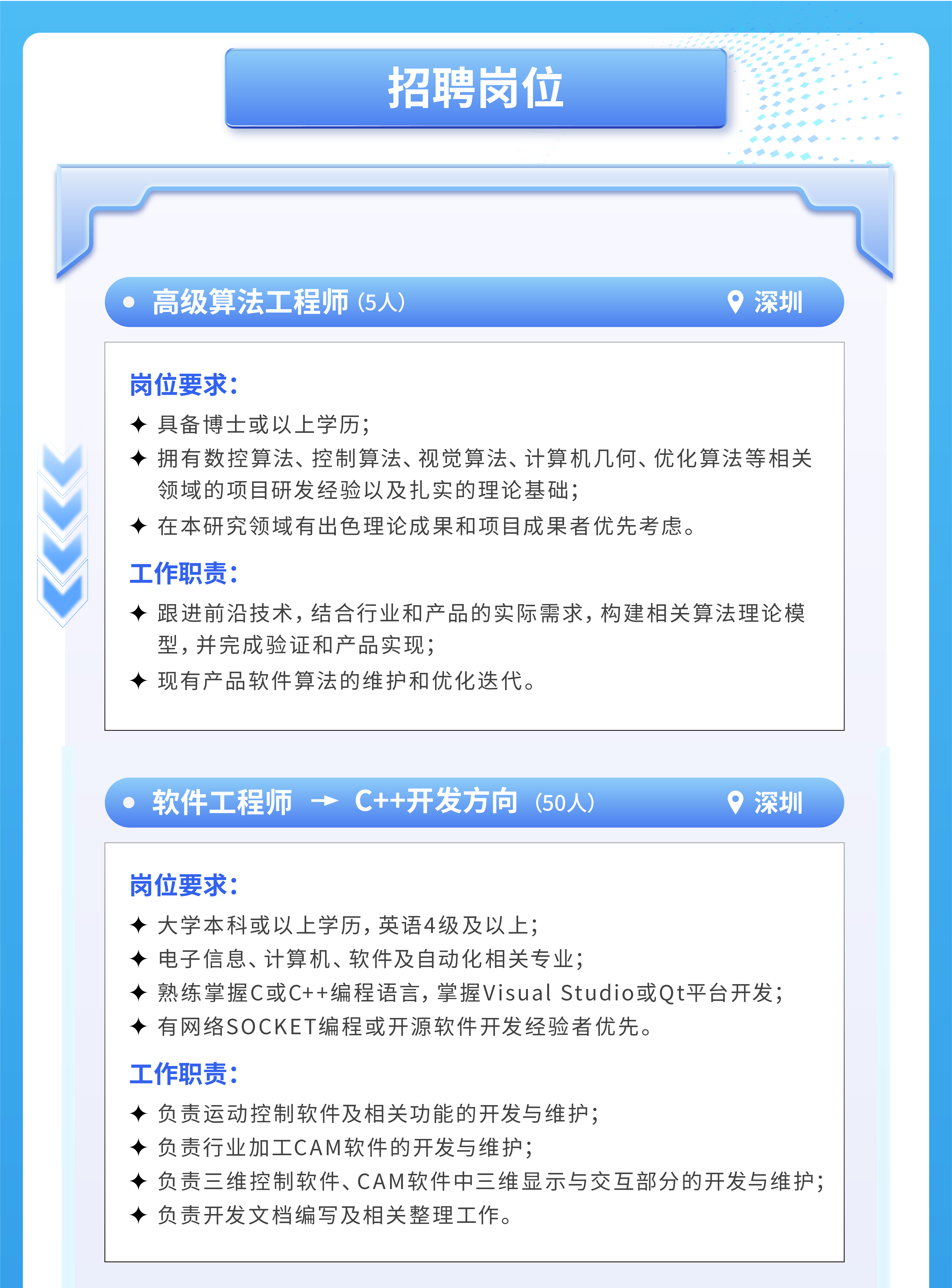 關(guān)鍵字:追光族夢(mèng) 智控未來丨2025年大族智控春季校園招聘火熱開啟!高級(jí)算法工程師,軟件工程師(C++開發(fā)方向、嵌入式開發(fā)方向、視覺應(yīng)用開發(fā)方向、AI應(yīng)用開發(fā)方向、運(yùn)動(dòng)控制算法研究方向、應(yīng)用工程師、工藝開發(fā)工程師),電控工程師,技術(shù)支持工程師。