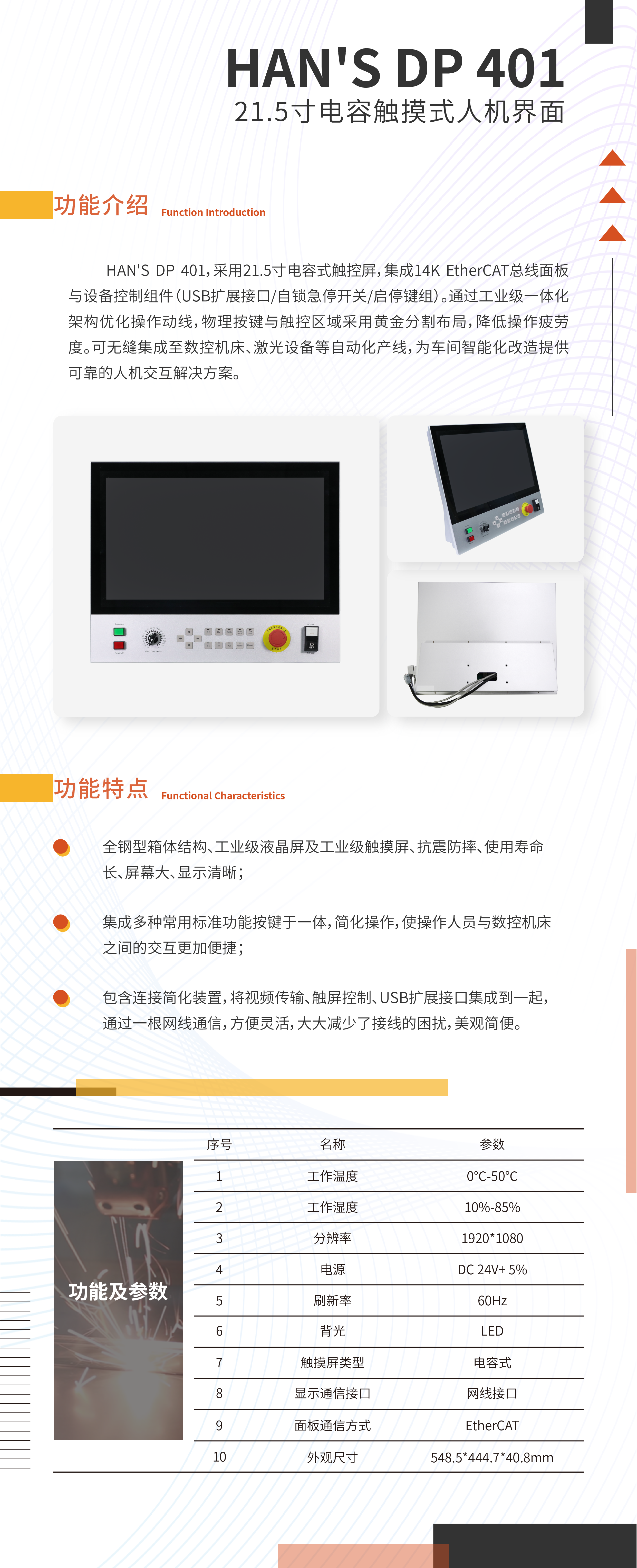 HAN'S DP 401,采用21.5寸電容式觸控屏,集成14K EtherCAT總線面板與設備控制組件(USB擴展接口/自鎖急停開關/啟停鍵組)。通過工業級一體化架構優化操作動線,物理按鍵與觸控區域采用黃金分割布局,降低操作疲勞度。可無縫集成至數控機床、激光設備等自動化產線,為車間智能化改造提供可靠的人機交互解決方案。