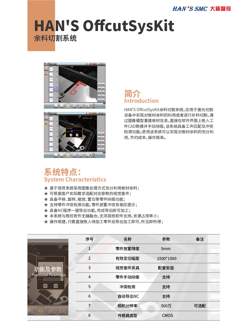 HAN'S OffcutSysKit切割余料系統(tǒng),應(yīng)用于激光切割設(shè)備中實(shí)現(xiàn)對(duì)板材余料的二次利用,采用機(jī)器視覺的方式充分發(fā)揮板材廢料價(jià)值,通過圖像模型重建板材信息、利用軟件手動(dòng)排版,并具備工件匹配及沖突檢測(cè)功能。本系統(tǒng)可以最大限度的發(fā)揮板材的廢料,節(jié)約成本,提高設(shè)備的加工效率,可用于激光切割的各類加工應(yīng)用中。